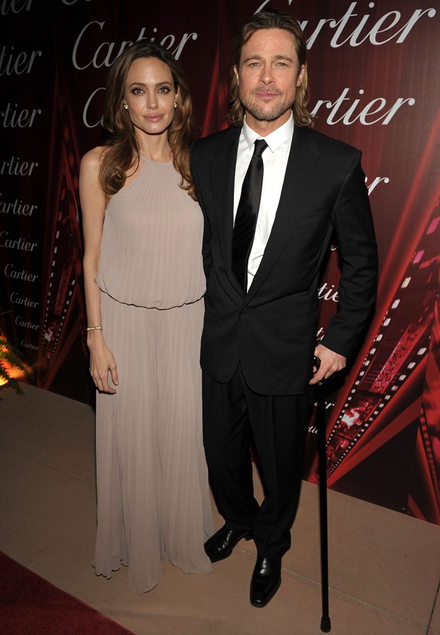 Snow joke: Brad Pitt revealed he injured his leg on a ski slope while carrying one of the twins as she arrived at a film gala with a cane beside partner Angelina Jolie