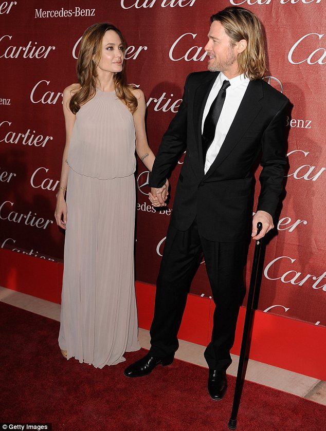 Snow joke: Brad Pitt revealed he injured his leg on a ski slope while carrying one of the twins as she arrived at a film gala with a cane beside partner Angelina JolieHe is said to be recovering from a torn medial collateral ligament and was seen walking with a cane on Thursday.