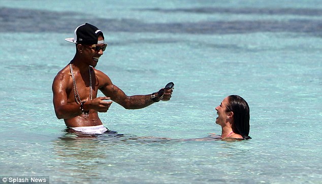 PDA: The couple stayed close to each other as they waded through the crystal clear waterFazer ensured he was heavily accessorised with his watch, belt, bracelets, necklaces and cap. The duo, who have known each other for well over a decade but officially began dating in May 2010, were in great spirits as they splashed about in the crystal clear sea.