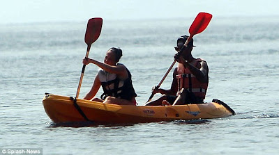 Teamwork: The duo carried their kayak out of the water and back to the beachThey also got in some exercise in between sunbathing and swimming with a little kayaking. Out of the water, the couple retreated to their deck chairs, where they lounged on the same bed. Fazer fell asleep in the sun while Tulisa became engrossed in her novel, Martina Cole's The Jump.