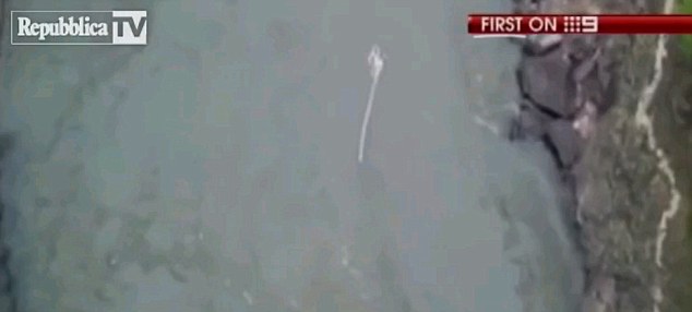 The cord snaps and half of it recoils back towards the ledge, right, while another piece can be seen heading for the water belowChilling footage of the incident shows the young holidaymaker, from Perth, leaping from the bridge which crosses a gorge 111 metres above the water.