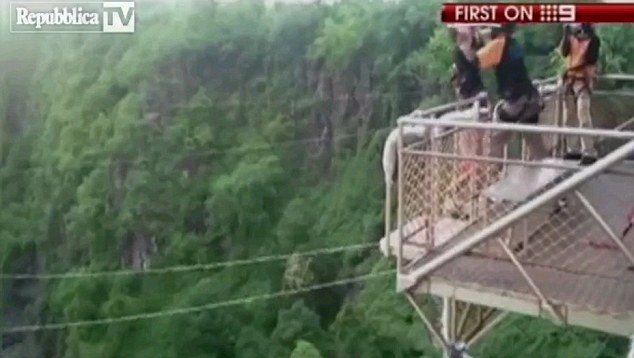 The cord snaps and half of it recoils back towards the ledge, right, while another piece can be seen heading for the water belowChilling footage of the incident shows the young holidaymaker, from Perth, leaping from the bridge which crosses a gorge 111 metres above the water.