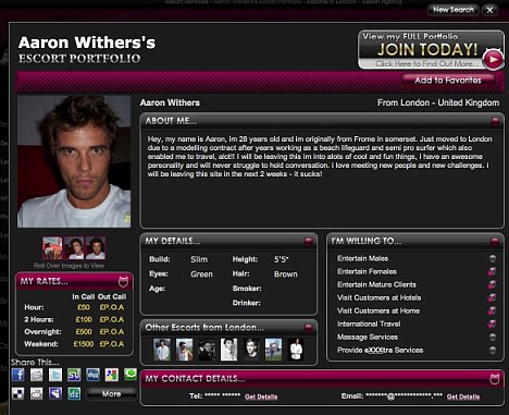 On his profile page on the site, which advertises the services of more than 5,000 escorts, Withers states his charges as £50 for an hour, £500 for an overnight visit or £1,500 for the whole weekend.